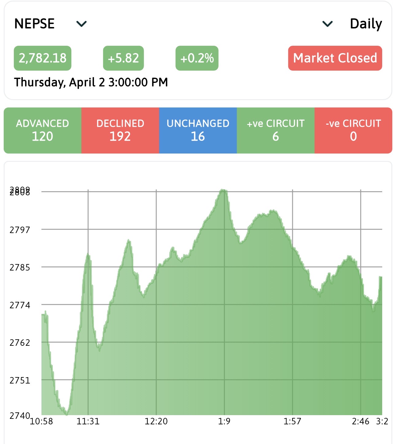 काठमाडौँ – नेपाली सेयर बजार मापक NEPSE Index बिहीबार ५.८२ अंकले बढेर २७८२.१८ विन्दुमा बन्द भएको छ।